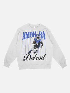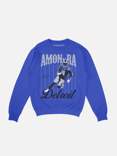 This retro Detroit football sweatshirt features a vintage illustration of wide receiver Amaon-Ra St. Brown. This blue and white retro grunge crewneck features a grunge illustration and is the perfect gift for Detroit football fans in the state of Michigan.