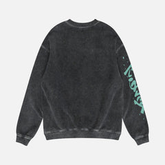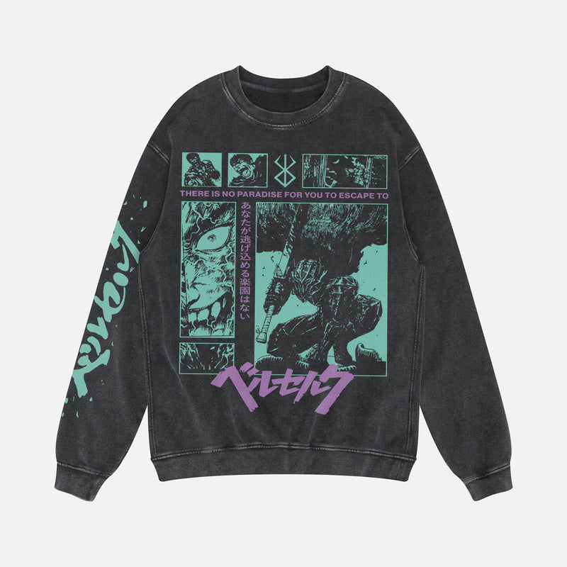 This grunge anime sweatshirt will make you go berserk with its streetwear-style aesthetic, faded vintage colors, and premium materials. Made from high-quality materials and printed on a garment-dyed crewneck sweatshirt, it is sure to make fans of retro anime merch go berserk. The vintage manga anime sweatshirt has a streetwear style design with a large, oversized graphic and the series logo in japanese text on the front and teal japanese text on the sleeve.