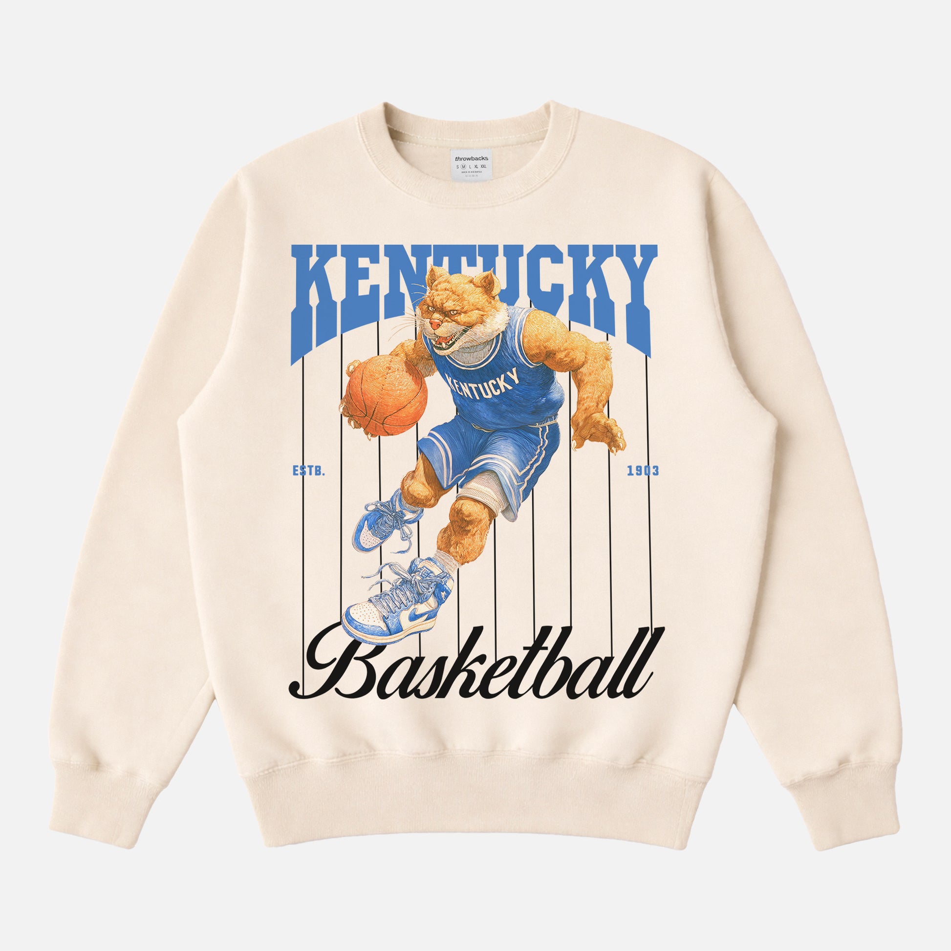 Bring blue-and-white pride to your winter rotation with the Kentucky Basketball Mascot Sweatshirt, a pinstripes crewneck built for fans of vintage college basketball apparel. The design takes cues from classic bookstore gear: thin vertical pinstripes, bold “Kentucky Basketball” lettering, and a vintage wildcat mascot front and center to give it that old-school arena feel. It looks like something you could’ve grabbed on campus in the 90s, updated with a cleaner, more streetwear-ready layout.