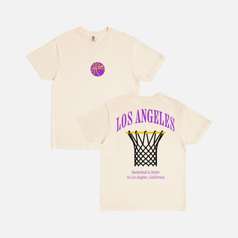Represent the electric energy of Los Angeles with the LA Basketball Hoop T-Shirt, crafted for true fans of West Coast hoops culture. This basketball streetwear t-shirt blends modern and retro styles to give it a unique look only available with Throwbacks basketball apparel can create. This exclusive design channels the iconic vibe of Los Angeles courts—where bold moves, creative play, and legendary games are part of everyday life. The centerpiece is a striking basketball hoop graphic, instantly recognizable and perfect for anyone who lives and breathes the game. Whether you're catching pickup runs at Venice Beach or repping your favorite LA players from the stands, this tee is on point for expressing city pride and love for the sport.