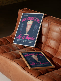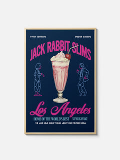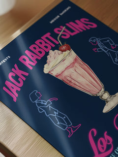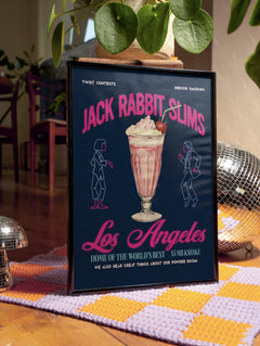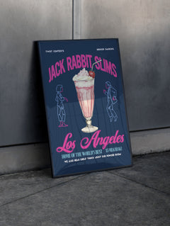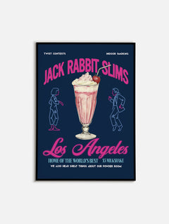 Head to sunny Jack Rabbit Slims in sunny Los Angeles, California with this awesome piece of retro movie wall art. This Tarantino-inspired poster pays homage to Jack Rabbit Slims with details about their Twist Competition, Their $5 milkshake and silhouettes of Mia Wallace and Vincent Vega and is designed with a retro neon lights style art.