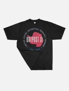 Head to Antarctica with this retro Outpost 31 graphic t-shirt. Inspired by the horror icon John Carpenter, this Outpost 31 logo badge tee shirt is the perfect piece of 80s horror movie memorabilia for fants of John MacCready, John Carpenter, or anybody in search of the thing that changes their wardrobe. Printed on a premium, medium-heavyweight fabric with a light blue, white, and pink graphic on a black t-shirt.
