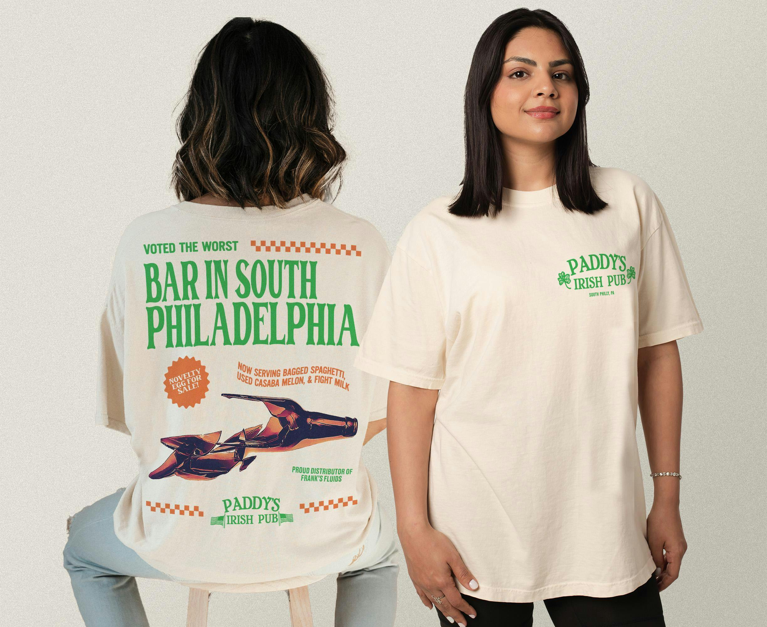 Show your love for the worst bar in Philadelphia with this retro Paddy's Irish Pub graphic tee shirt. Printed on a medium heavyweight unisex t-shirt and available in either faded dark green or faded light green colors, this shirt will make your days always sunny. This Paddys Pub graphic tee features a custom logo on the front and a vintage oversized print on the back of a broken beer bottle and other details about the Philly pub.