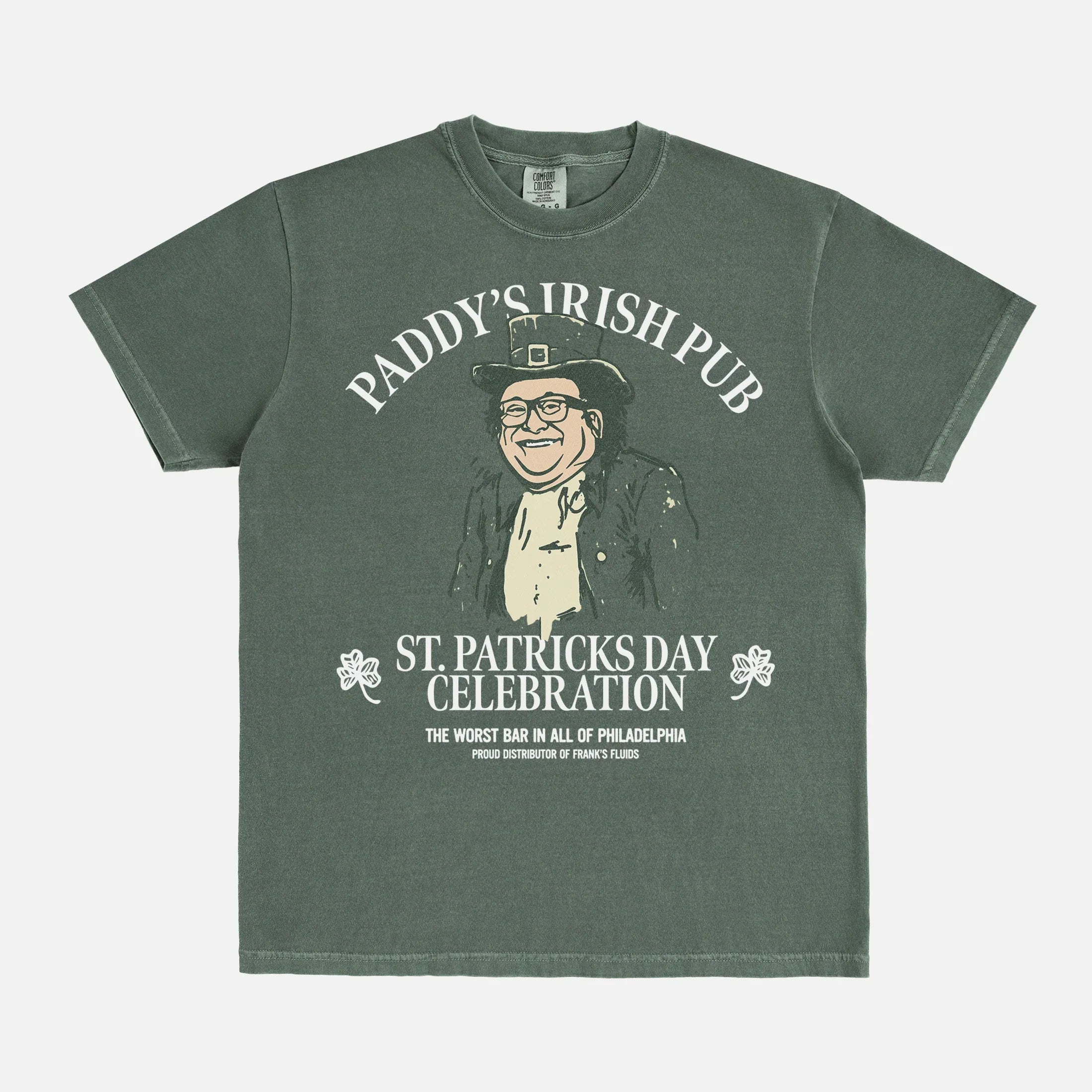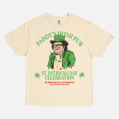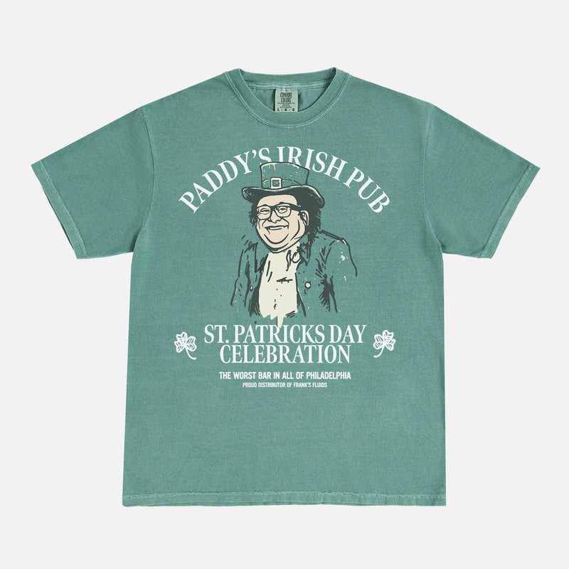 Show your love for the worst bar in all of Philadelphia with this Paddy's Irish Pub St. Patrick's day graphic tee shirt. Featuring a custom illustration of Frank Reynold's as a Leprechaun, this funny always sunny graphic t-shirt is in Philadelphia and beyond and is an awesome piece of TV show merch to add to your graphic tee collection.
