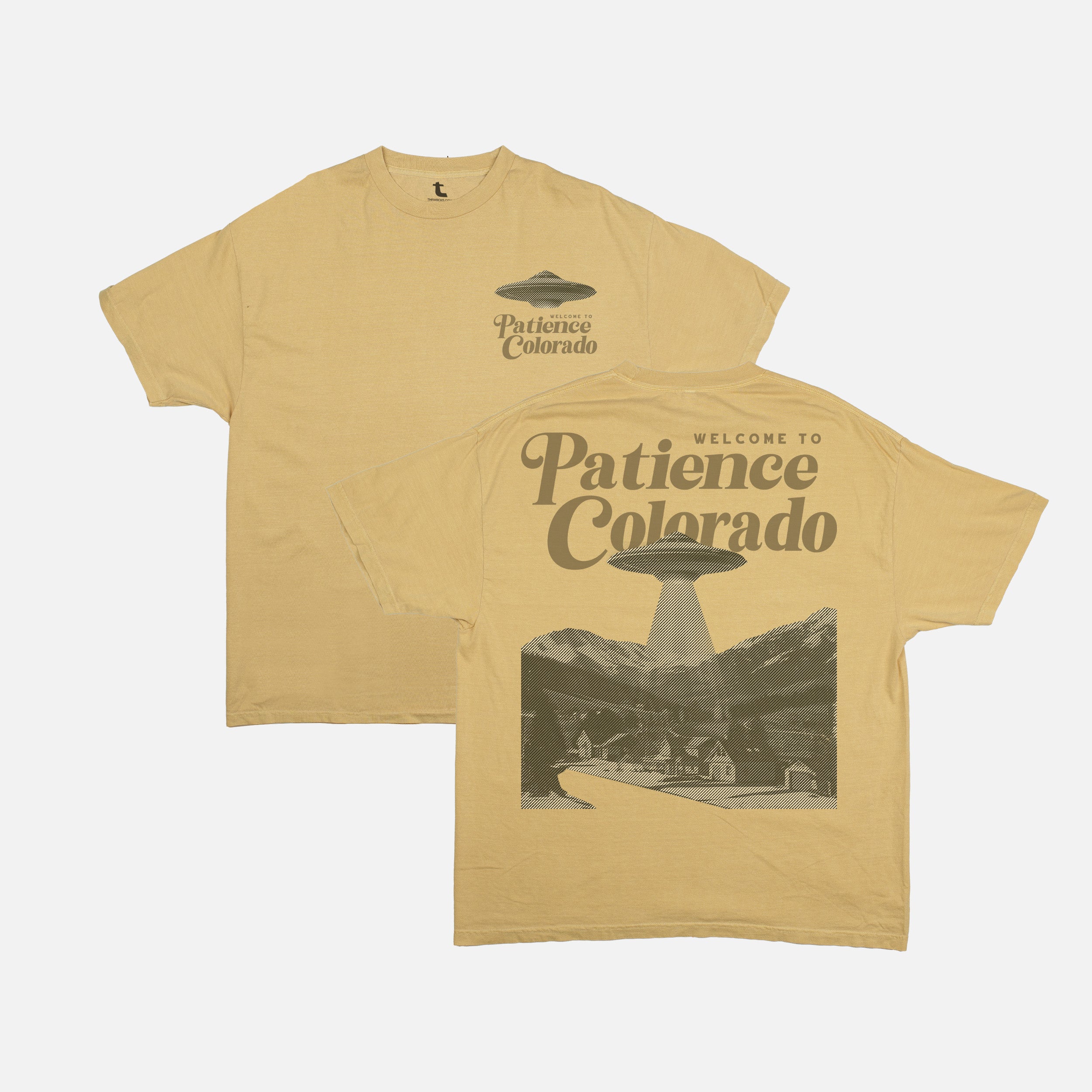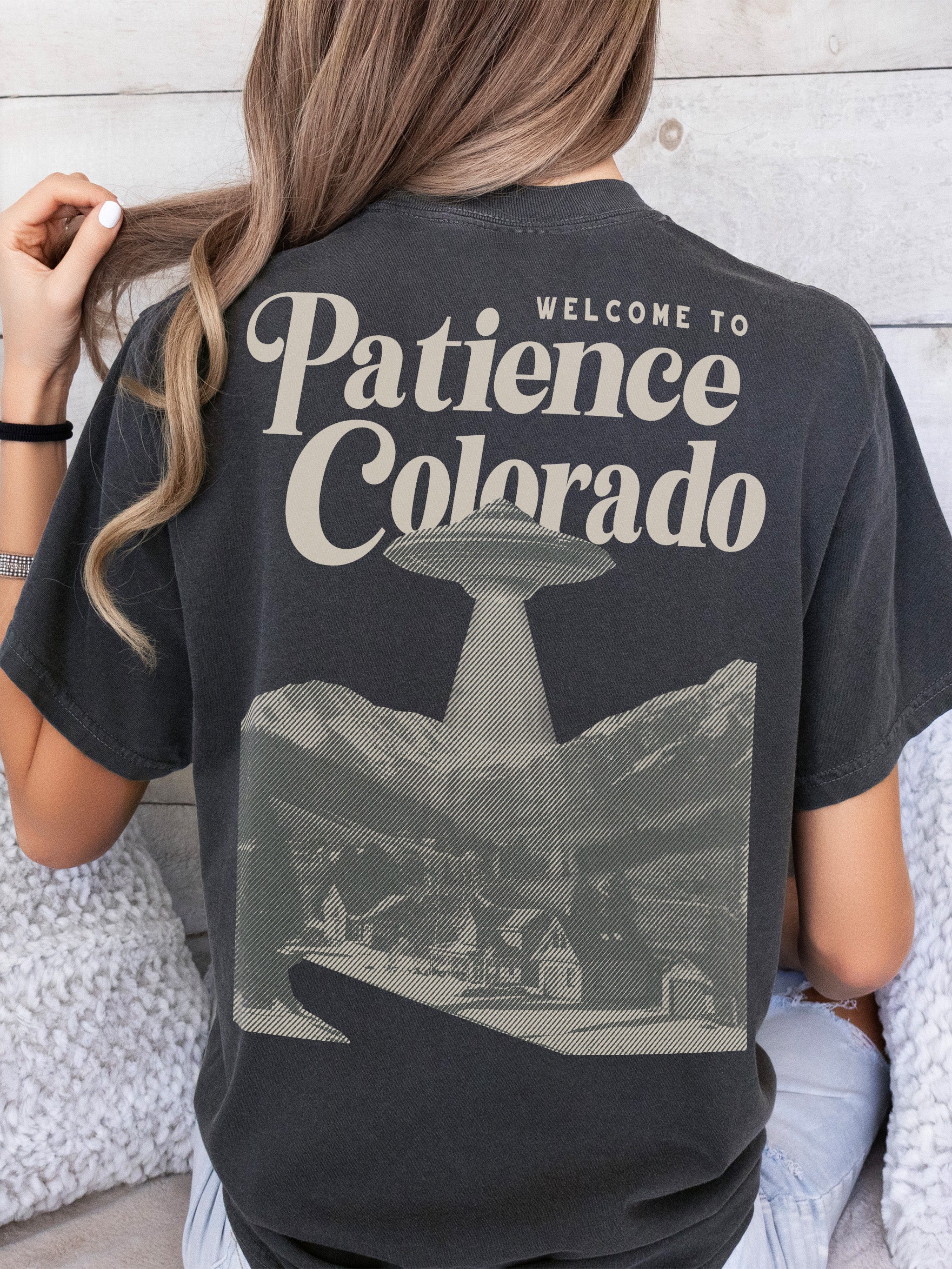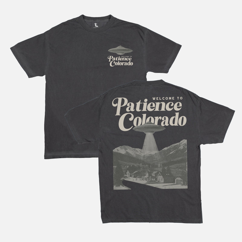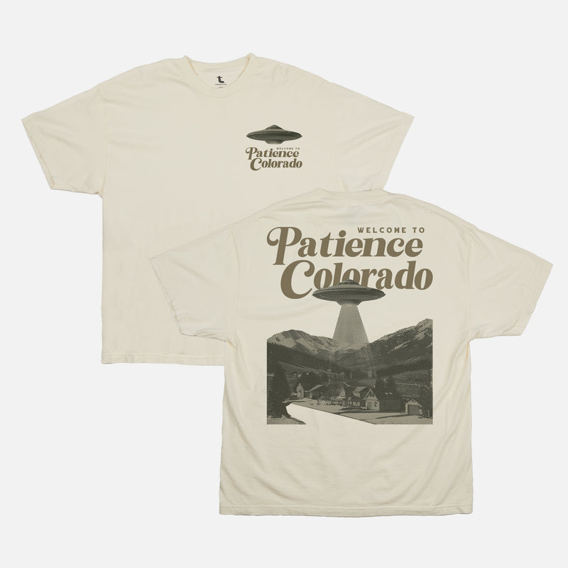 This funny vintage Patience, Colorado TV show graphic tee features a custom logo design on the front with a retro city logo and a large halftone illustration of an Alien spaceship over a resident of Patience on the back. The perfect piece of TV show apparel and memorabilia for fans of sci-fi or comedies or for anybody who loves aliens and UFOs.