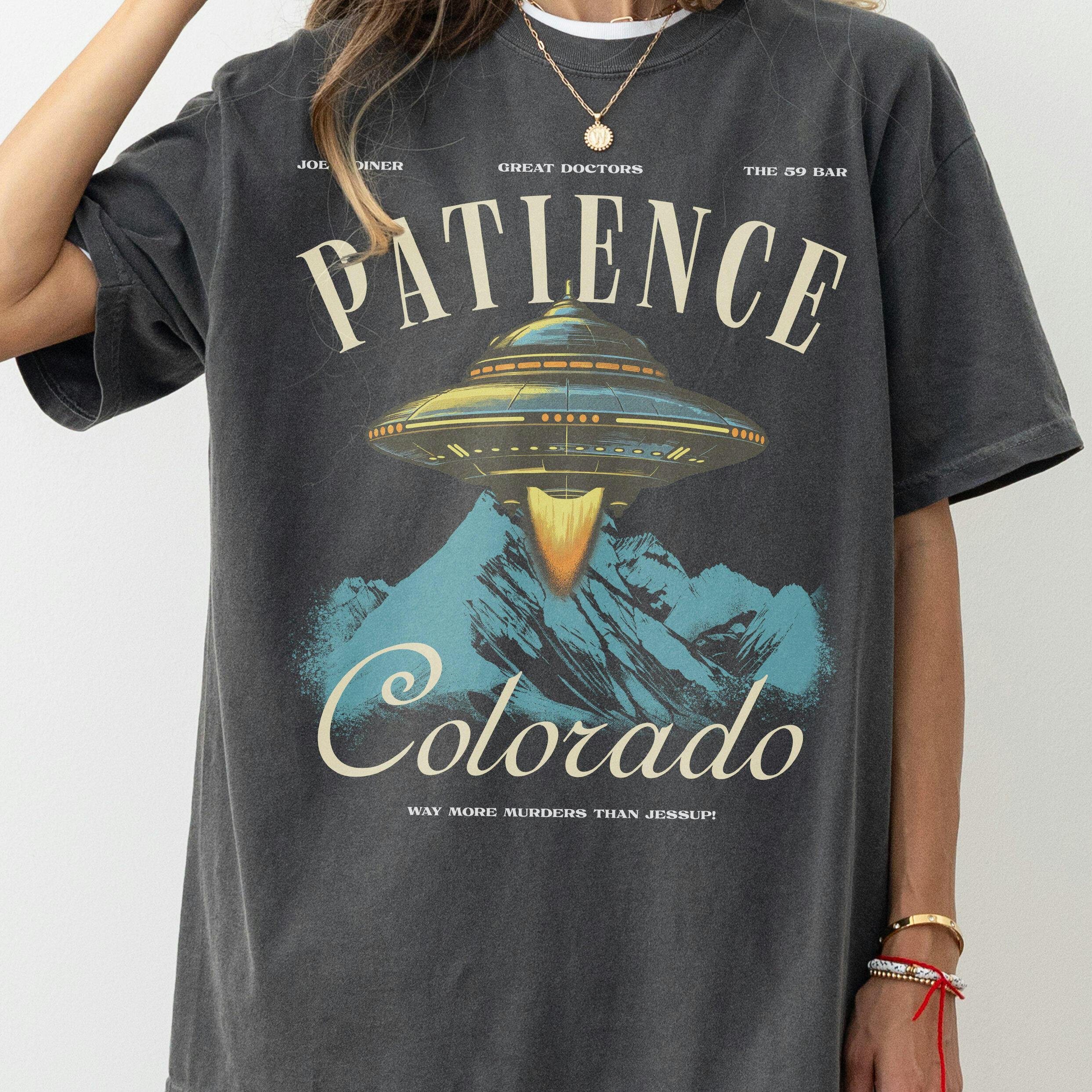 This funny Patience, Colorado Resident Alien TV show t-shirt is the perfect piece of TV show merch for sale online for the resident alien in your life, fans of funny tv show shirts, or for anybody in need of a vintage Alien UFO style shirt. Available in two retro washed colors, this resident alien-inspired t-shirt is the perfect piece of memorabilia for your collection.