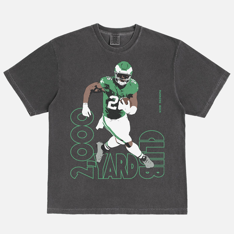 This Saquon Barkley inspired t-shirt was designed by Throwbacks to honor the incredible feet of rushing for 2,000 yards. The perfect gift for Philadelphia football fans, this Saquon graphic tee is printed on a premium unisex garment-dyed shirt for both men and women. The Barkley running back t-shirt perfect gift for Philadelphia football fans or to wear as football game day apparel, this premium Saquon Barkley hurdle poster graphic tee shirt boasts an array of enticing, features tailored specifically for football aficionados and fans of the football in Philly.