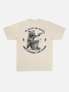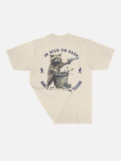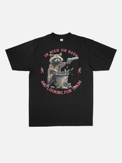 This funny raccoon t-shirt is a guaranteed conversation starter and the perfect funny gift for that weirdo in your life who loves random animal t-shirts. Featuring a raccoon holding a firearm and text reading "I'm High on Hash and Looking for Trash", this weird random shirt also features two small silhouettes of sasquatch for no reason at all and is available in beige/natural and black.