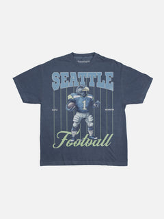 Fly high to your next football game in Seattle with this retro navy blue and green Seattle Football Mascot graphic t-shirt featuring a custom retro illustration of a hawk dressed as a football play, pinstripes, and Seattle Football text. This graphic tee shirt comes in a unsiex size for men and women and printed on a medium-heavyweight garment-dyed/washed navy blue shirt.