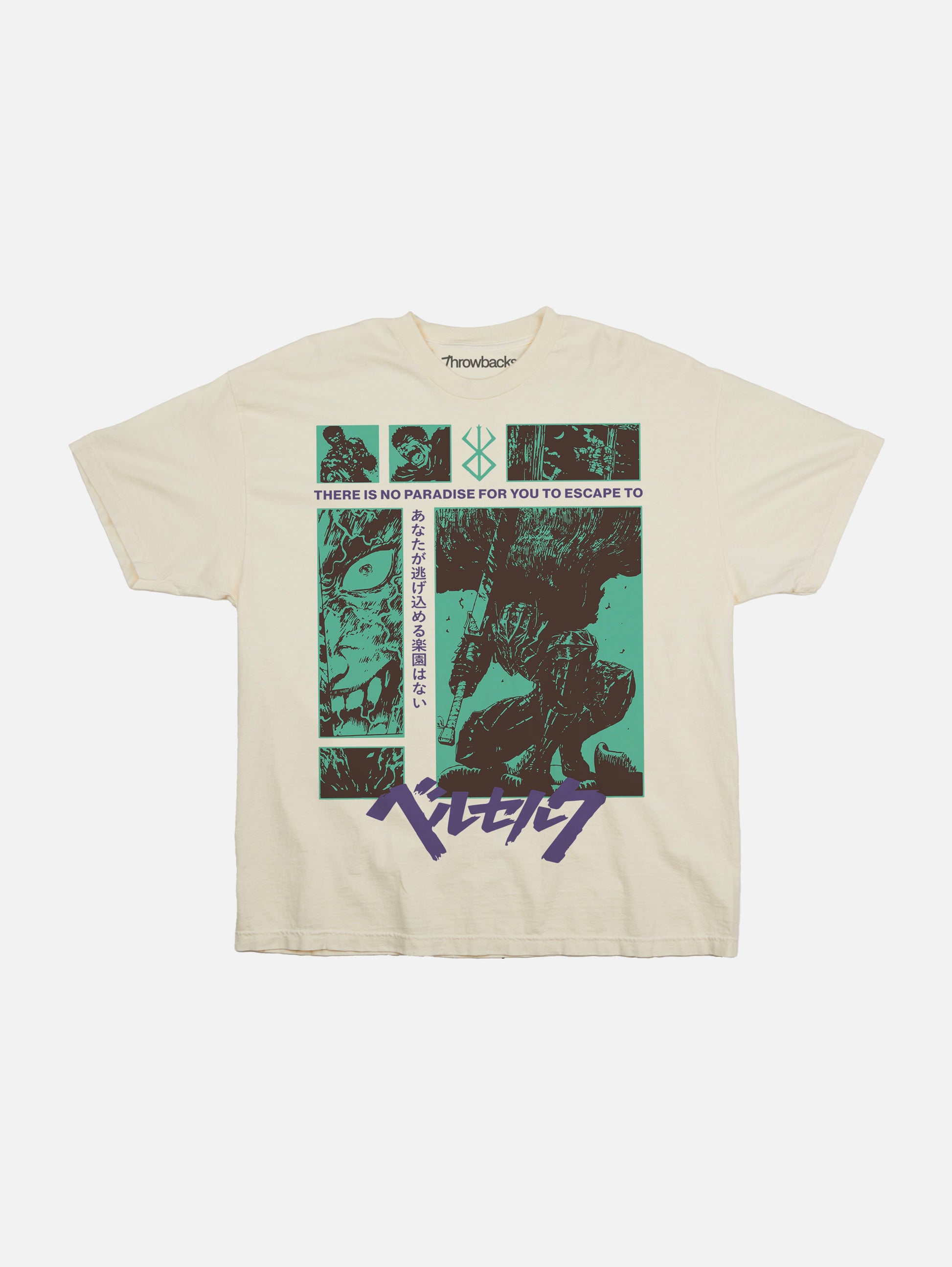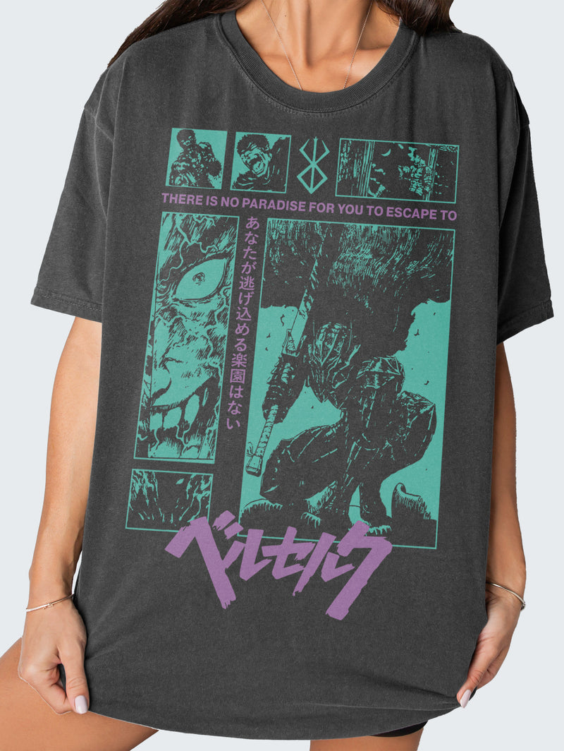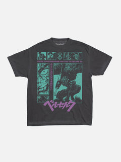 Step back into the 90s with this Grunge Berserk Anime Shirt. Featuring a detailed teal green and purple Berserk graphic on authentically faded black, this tee delivers the perfect vintage vibe.