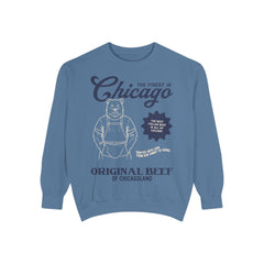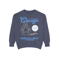 This retro Original Beef of Chicagoland crewneck sweatshirt features a custom illustration of a restaurant advertisement for the Original Beef restaurant in Chicago of a bear with Carmy's tattoos for Jeremy Allen White's character, this the bear sweatshirt is the perfect piece of memorabilia for anybody who loves the TV show The Bear, Jeremy Allen White, Chicago, or just needs a retro restaurant graphic pullover sweatshirt.