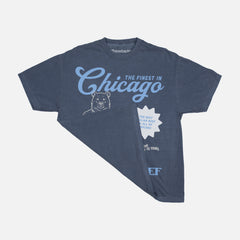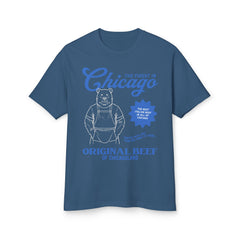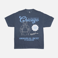 Faded navy unisex t-shirt with a cool illustration of a bear with Carmi tattoos and retro promo ad graphic of the Original Beef restaurant in Chicago, Illinois.