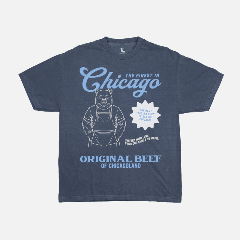 This unisex faded washed navy blue retro Original Beef graphic t-shirt features bear with Carmi AKA Jeremy Allen White's tattoos wearing an Original Beef Chicago apron. This t-shirt is the perfect piece of tv show memorabilia for anybody who loves the the bear, Chicago, Jeremy Allen White, Chicagoland, or just needs a vintage food or restaurant graphic t-shirt or a funny food shirt.