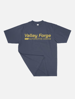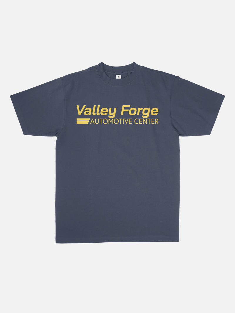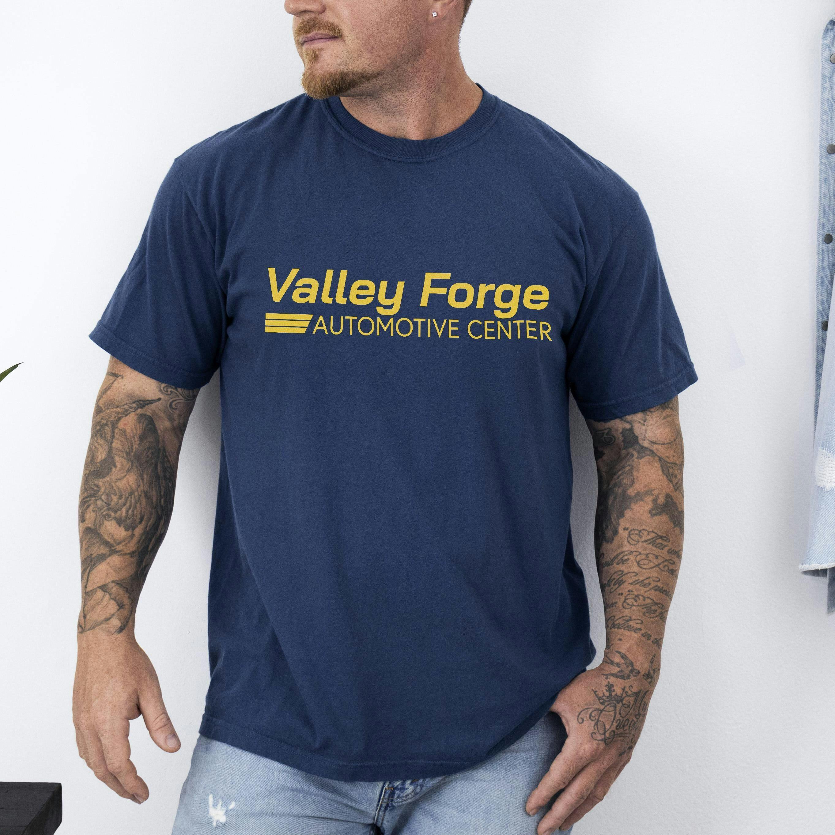 This Valley Forge Automotive logo graphic t-shirt features a yellow Valley Forge Automotive Center is simply a random auto store and has nothing to do with any sort of tv show show or tires stores. This retro Valley Forge logo graphic t-shirt is a unisex fit for men and women and is printed on your on a navy t-shirt.
